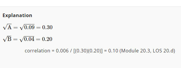 The variance of returns is 0.09 for Stock A and 0.04 for Stock B. The covariance between the returns of A and B is 0.006. The correlation of returns between A and B is: