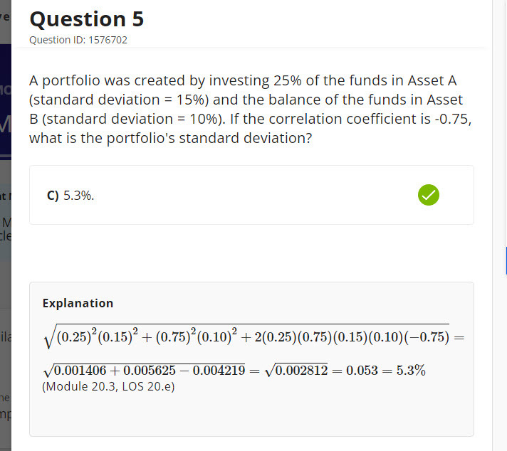 A portfolio was created by investing 25% of the funds in Asset A (standard deviation = 15%) and the balance of the funds in Asset B (standard deviation = 10%). If the correlation coefficient is -0.75, what is the portfolio’s standard deviation?