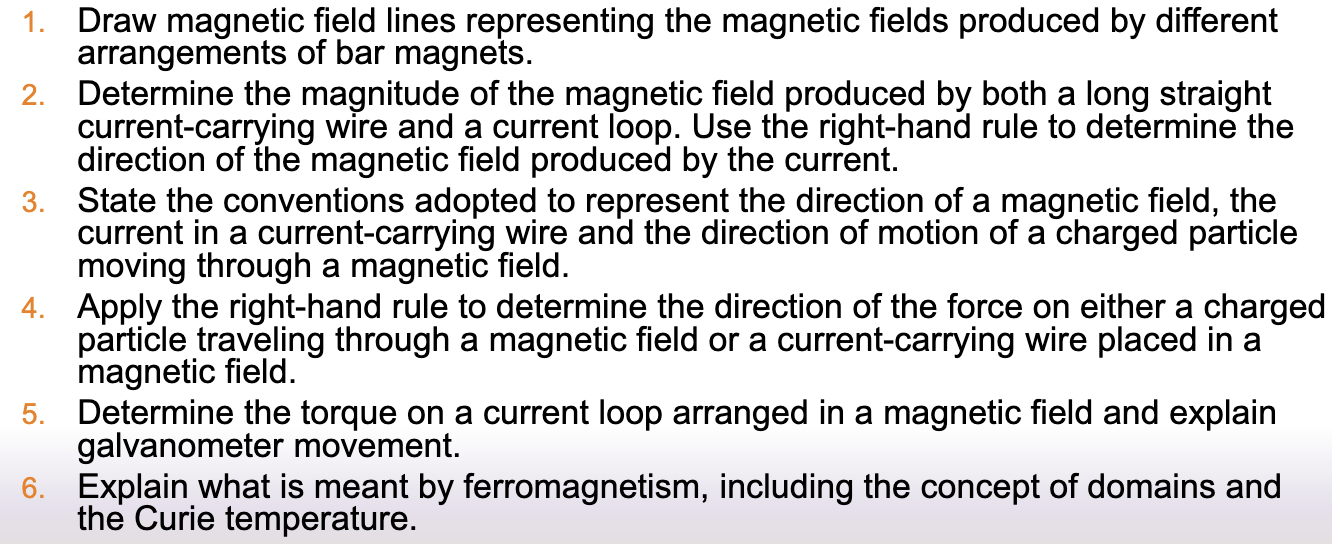 1. Draw magnetic field lines representing the magnetic fields produced by different arrangements of bar magnets. 2. Determine the magnitude of the magnetic field produced by both a long straight current-carrying wire and a current loop. Use the right hand rule to determine the direction of the magnetic field produced by the current. 3. Explain what is meant by ferromagnetism, including the concept of domains and the Curie temperature. 4. State the conventions adopted to represent the direction