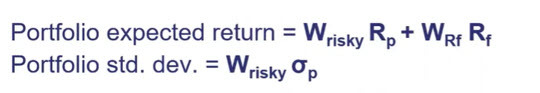 In the previous reading, we covered the mathematics of calculating the risk and return of a portfolio with a PERCENTAGE weight of WA invested in a risky portfolio (P) and a weight of WB = 1 − WA invested in a risk-free asset.