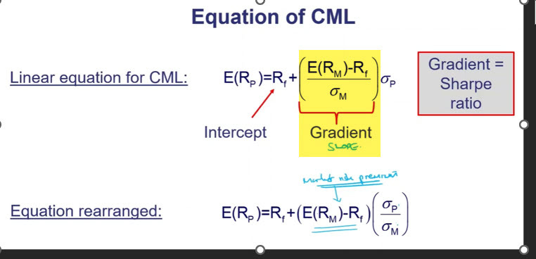 - CML slope is the sharpe ratio of market port.