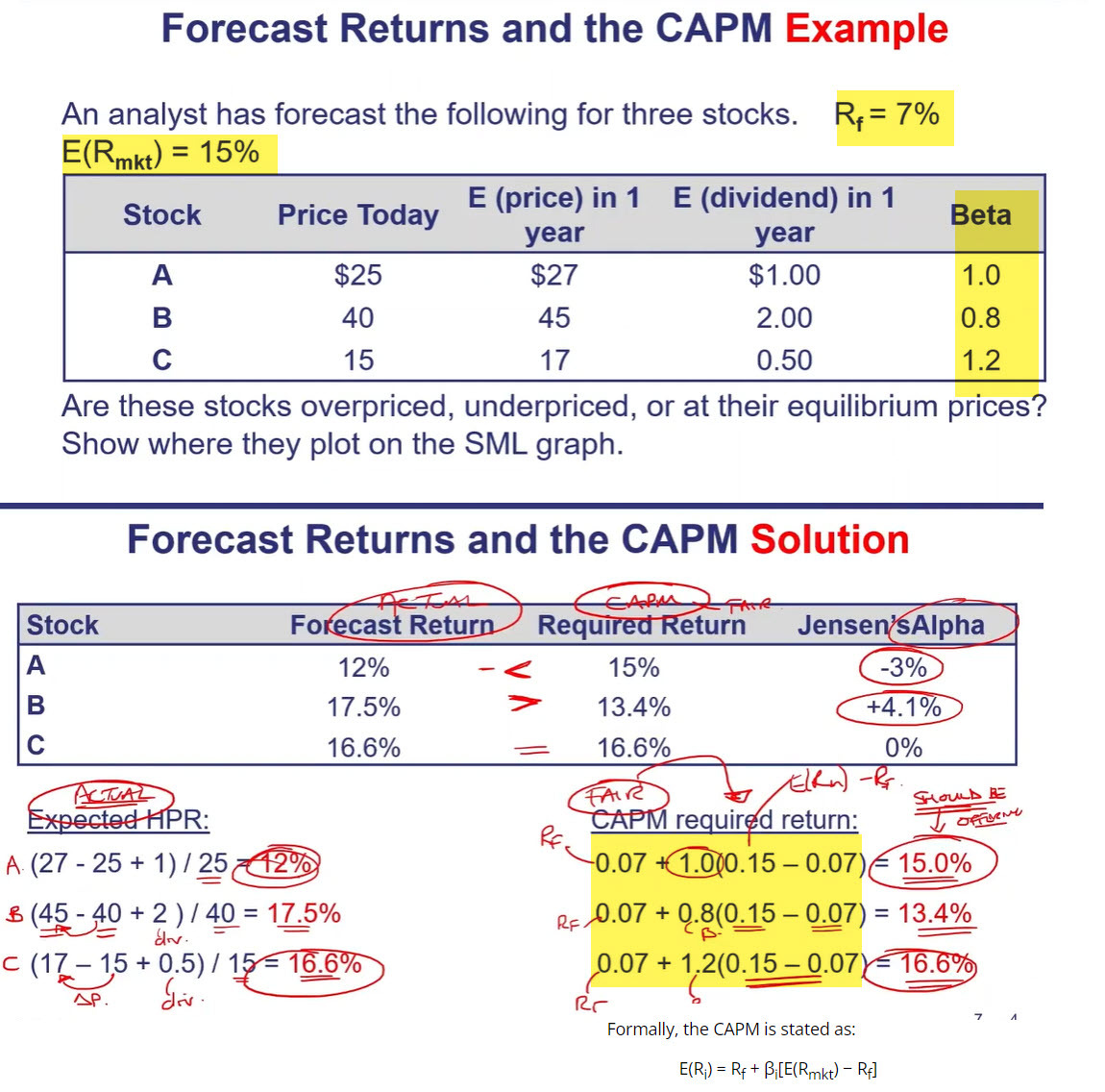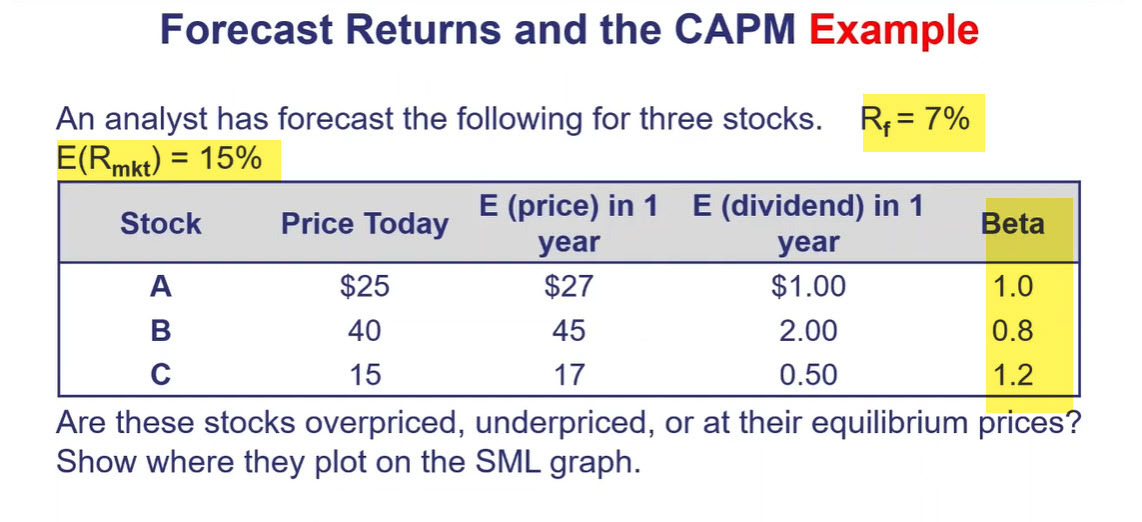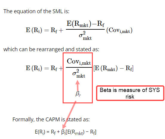 - SML based on SYSTEMATIC RISK which is BETA CAPM is expected return on asset based ONLY on beta (sys risk). CAPM gives us a number tells us what fiar return should be for security: