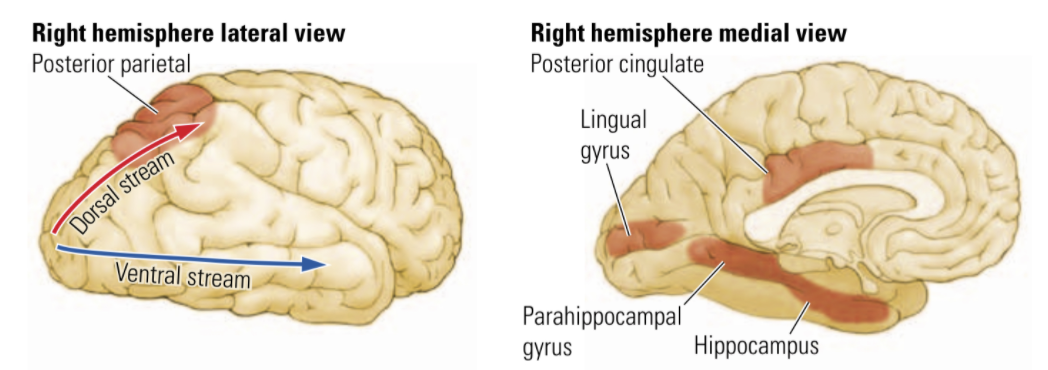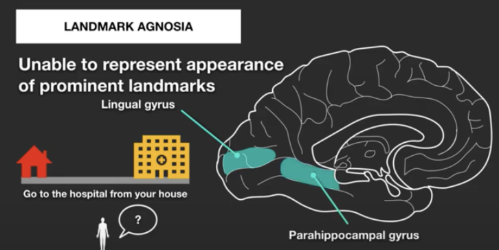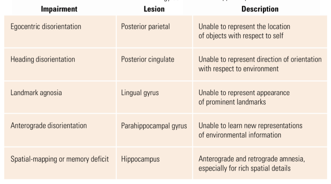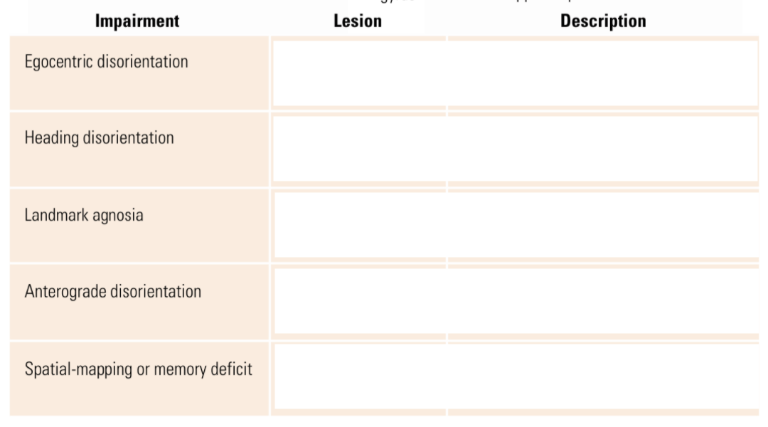 retrograde spatial amnesia, anterograde spatial amnesia, egocentric disorientation, heading disorientation, landmark agnosia, anterograde disorientation, spatial distortion deficits