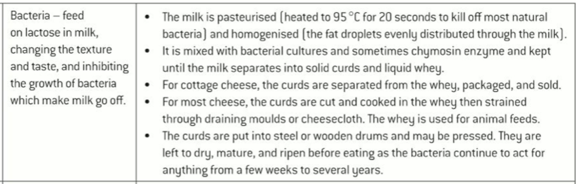 Traditionally bacteria are used in cheesemaking (Table 1) and proteolytic enzymes are also added to the milk to help form curds and whey.