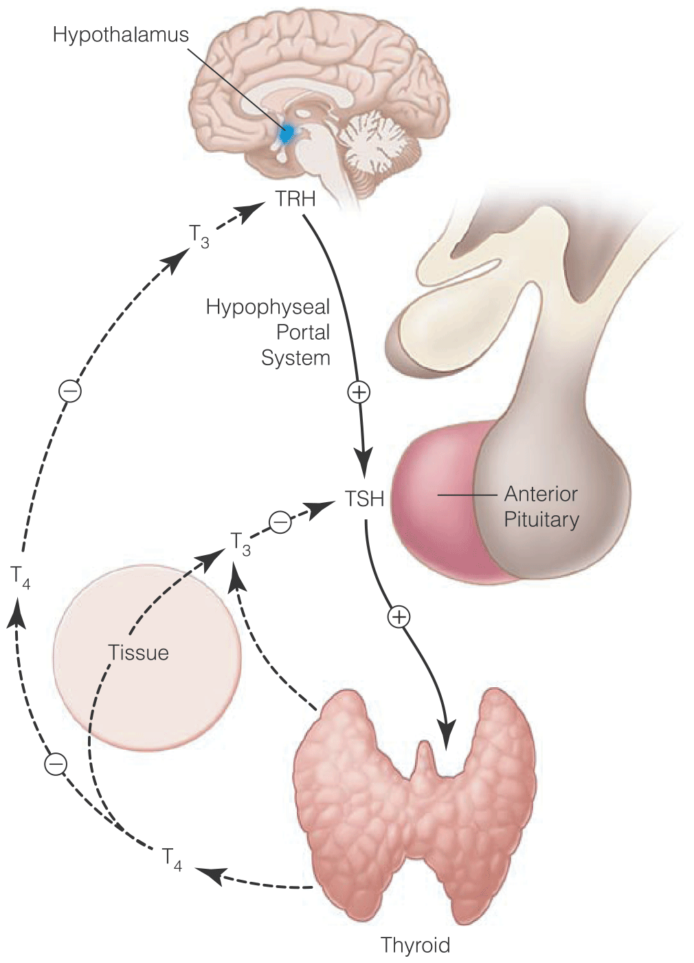 Hypothalamus -> anterior pituitary gland - release of TSH.