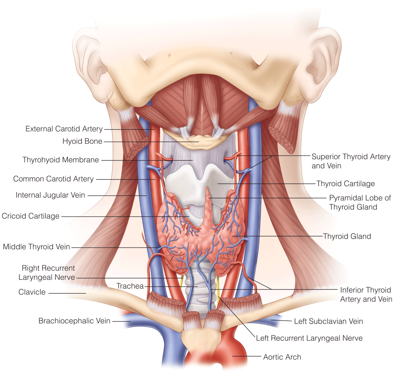Close to thyroid to avoid injury to parathyroid glands and nerves