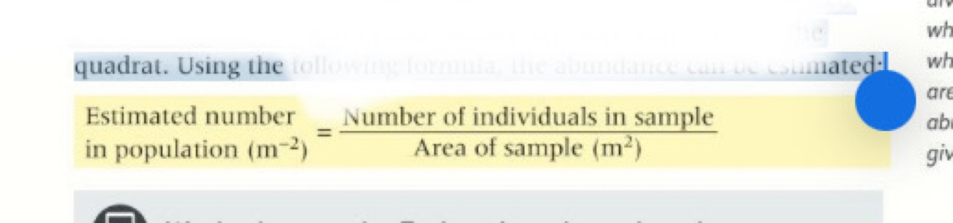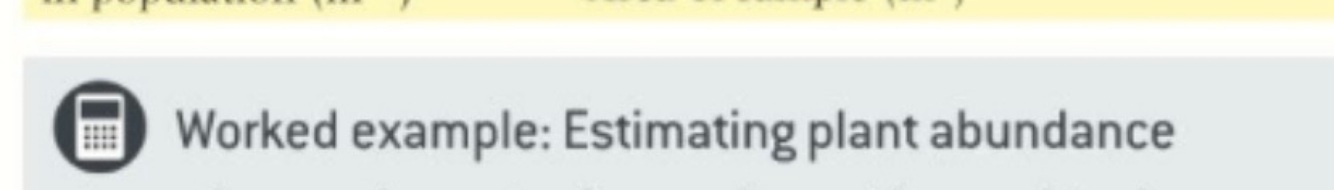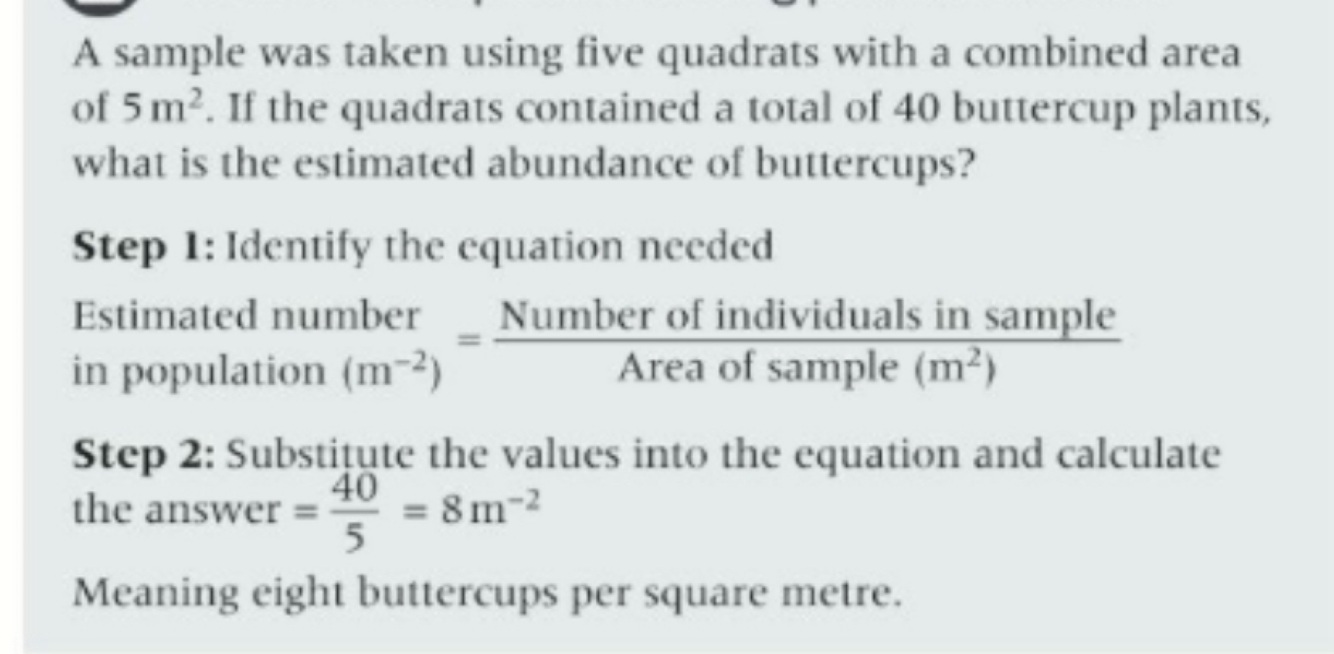 To measure the abundance of plants, quadrats are placed randomly in an area. The abundance of the organisms in that area is measured by counting the number of individual plants contained within the quadrat. Using the following formula, the abundance can be estimated: