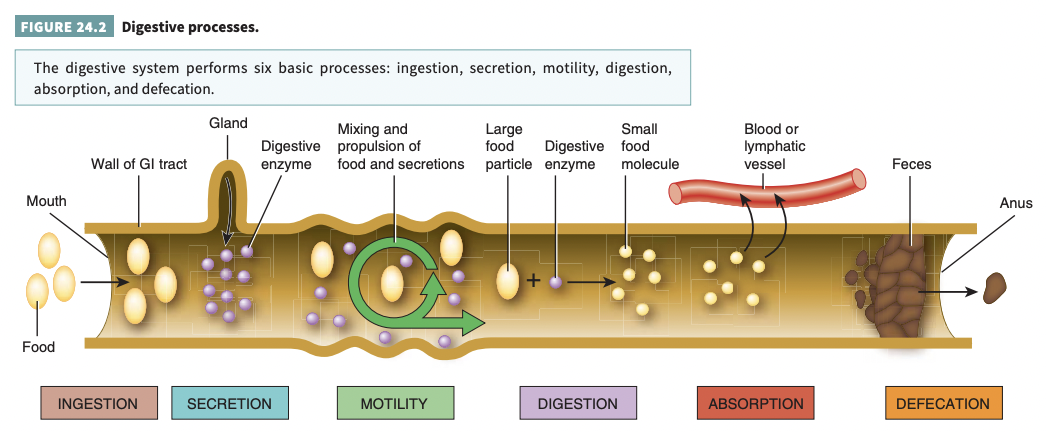 What are the six basic processes that the digestive system performs? Describe them: