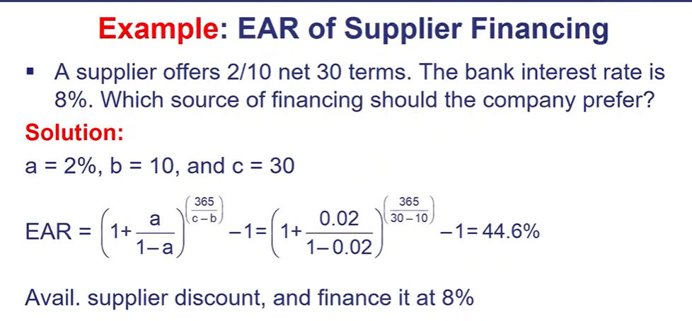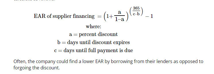The cost of implicit supplier financing is much higher than the cost of explicit bank financing of 6.5%.