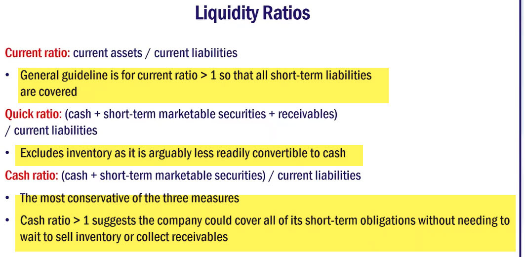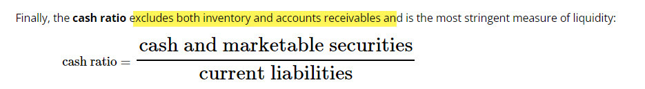 Cash ratio > 1 suggest the co could cover all its ST obligations w/o needing to wait to sell inventory or collect receivables.