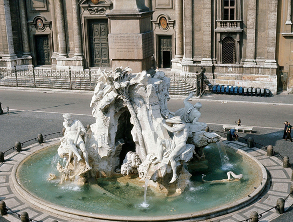 GIANLORENZO BERNINI, Fountain of the Four Rivers, Piazza Navona, Rome, Italy, 1648–1651. Travertine and marble figures, granite obelisk.