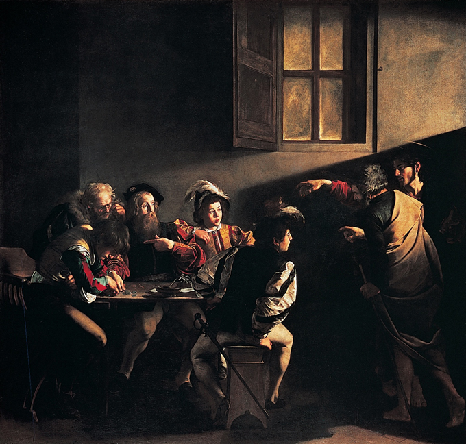 Figure 24-17 CARAVAGGIO, Calling of Saint Matthew, ca. 1597–1601. Oil on canvas, 11’ 1” x 11’ 5”. Contarelli Chapel, San Luigi dei Francesi, Rome