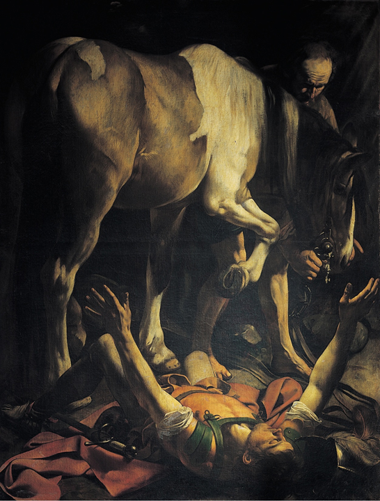 Figure 24-18 CARAVAGGIO, The Conversion on the Way to Damascus, ca. 1601. Oil on canvas, 7’ 6” x 5’ 9”. Cerasi Chapel, Santa Maria del Popolo, Rome.