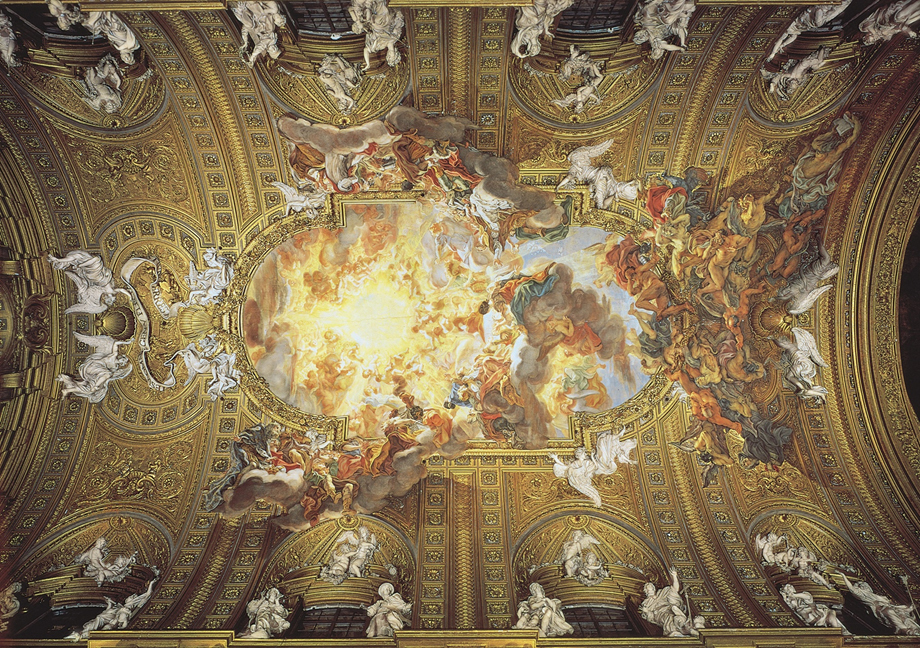 Figure 24-23 GIOVANNI BATTISTA GAULLI, Triumph of the Name of Jesus, ceiling fresco with stucco figures in the nave vault of Il Gesù, Rome, Italy, 1676–1679.