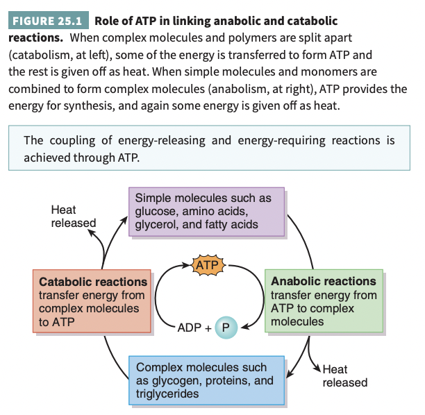About 40% of the energy released in catabolism is used for cellular functions; the rest is converted to heat, some of which helps maintain normal body temperature.