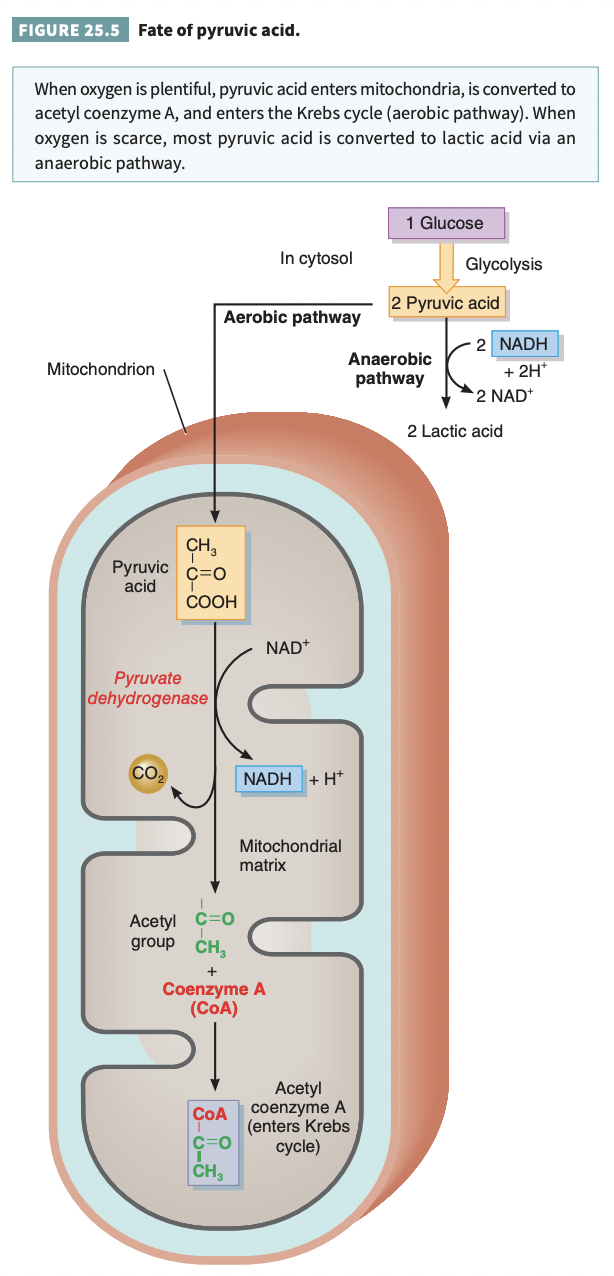 When oxygen is plentiful, pyruvic acid enters mitochondria, is converted to acetyl coenzyme A, and enters the Krebs cycle (aerobic pathway). When oxygen is scarce, most pyruvic acid is converted to lactic acid via an anaerobic pathway.