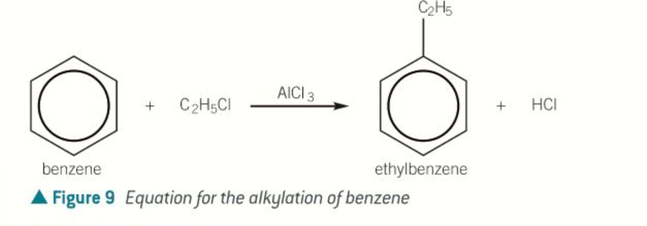 In alkylation, a haloalkane is reacted with an aromatic compound to introduce an alkyl group to the benzene group. a halogen carrier is required.
