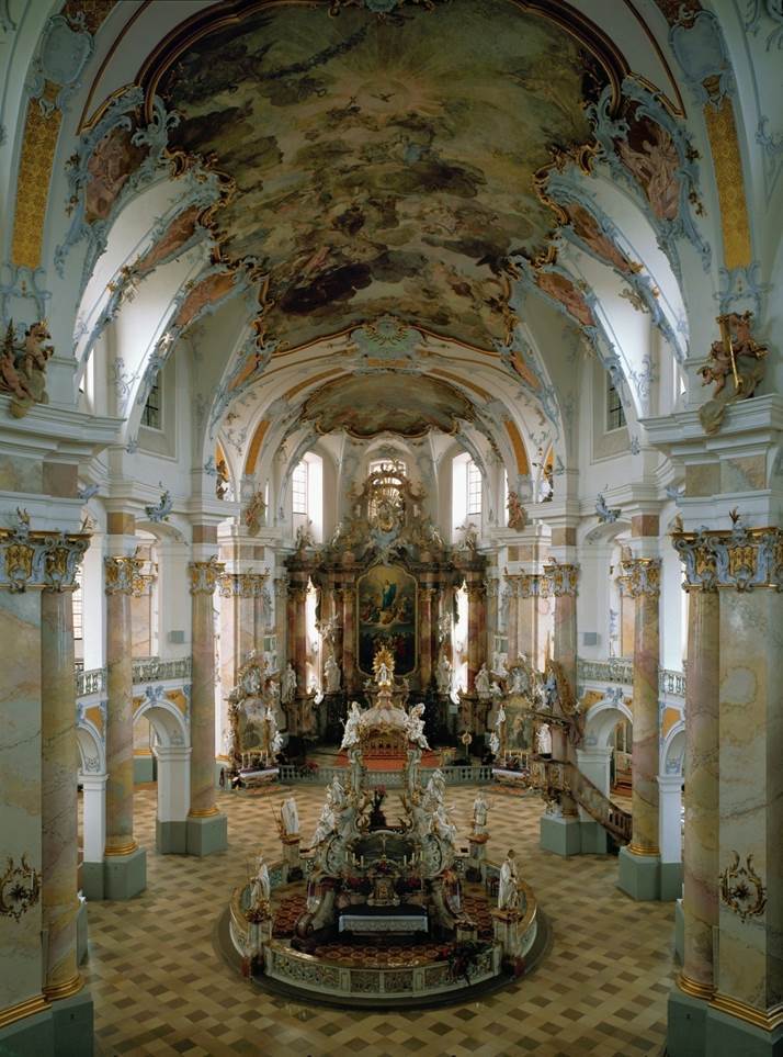 Figure 26-4 & 26-5 BALTHASAR NEUMANN, interior (left) and plan (right) of the pilgrimage church of Vierzehnheiligen, near Staffelstein, Germany, 1743-1772.