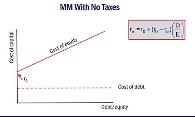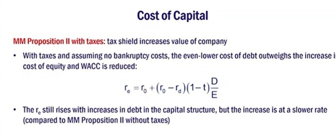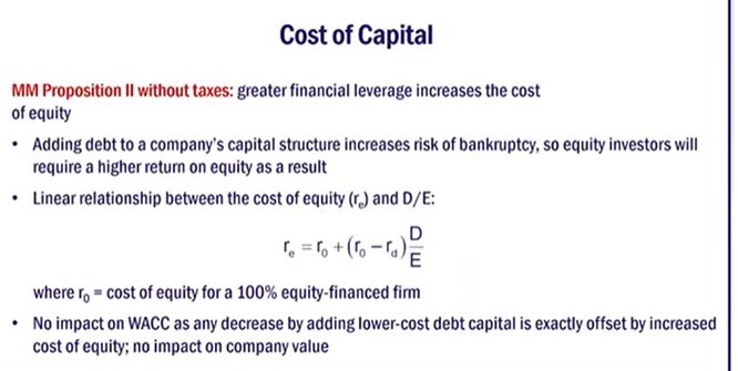 In other words - The conclusion of MM II is that the decrease in financing costs from using a larger proportion of (lower-cost) debt is just offset by the increase in the cost of equity, resulting in no change in the firm’s WACC