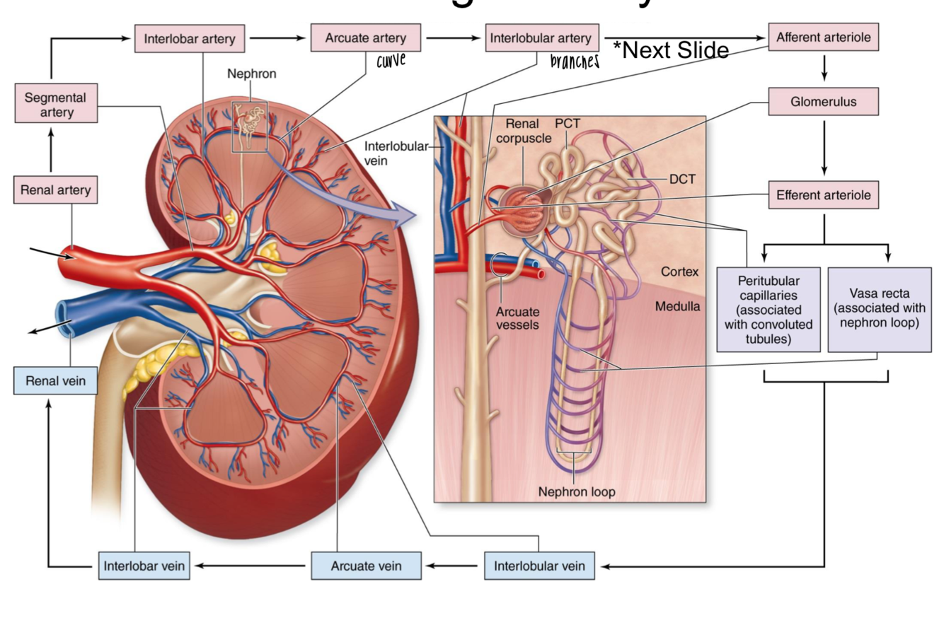 Distal convoluted tubule > collecting tubules > papillary ducts > renal papilla > minor calyx > major calyx > renal pelvis > ureter