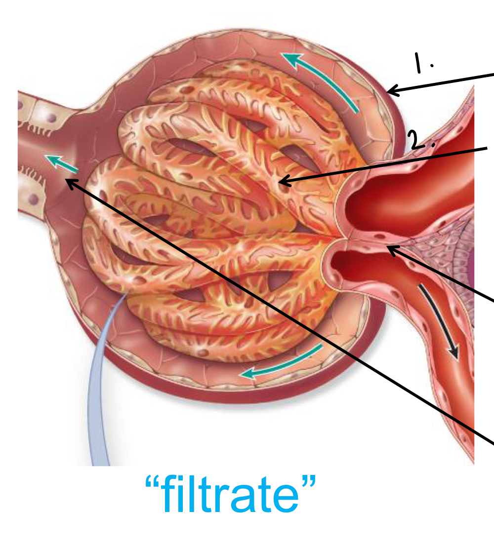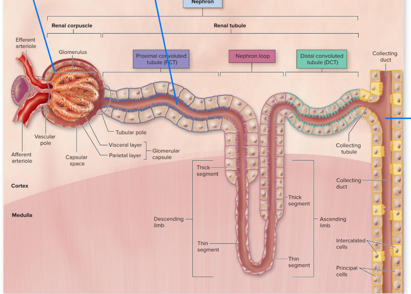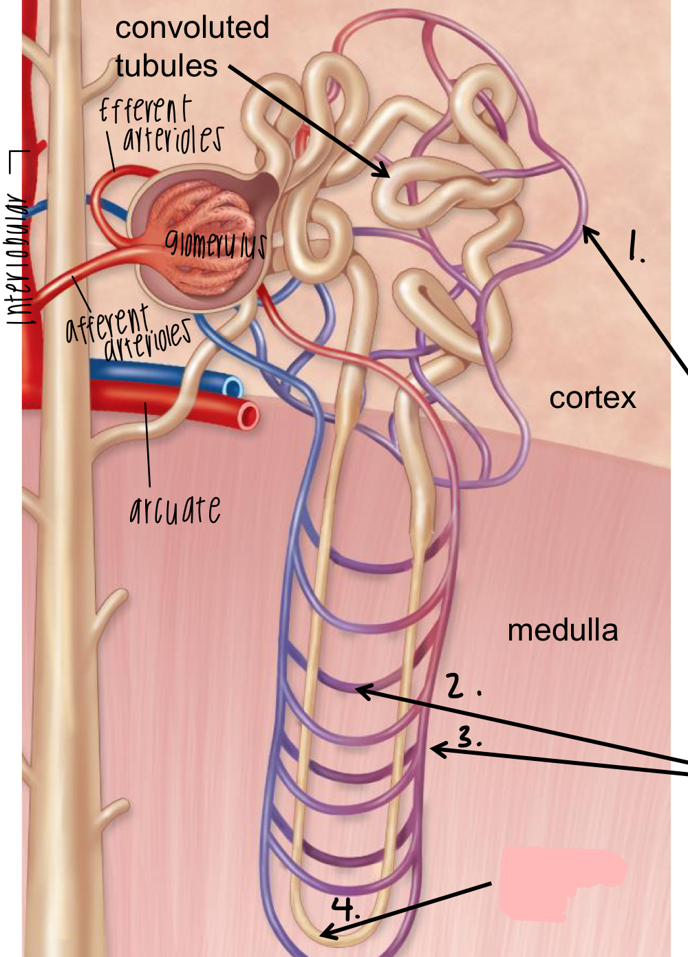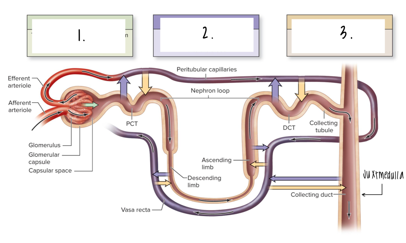 Describe what substance is being moved/where during the formation of urine at each stage.