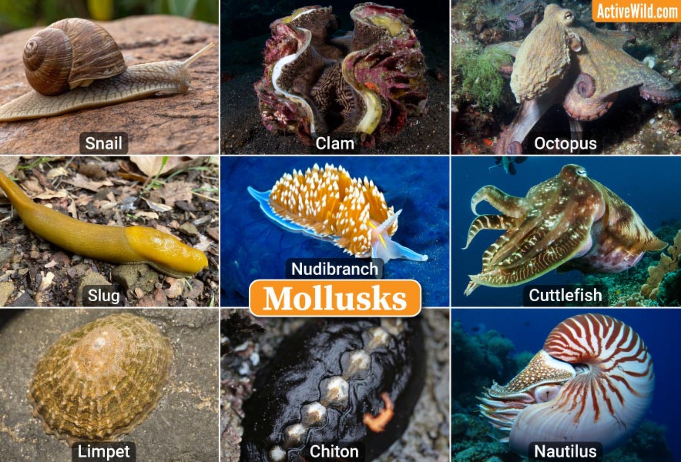 Second largest animal phylum besides Arthropoda. They have a MANTLE (which sheds their shell), a MUSCULAR FOOT (which helps them move around) and a VISCERAL MASS (where their organs are)