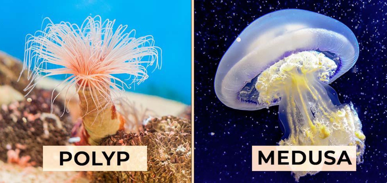Medusa: bell shaped body with its mouth on the underside (motile)