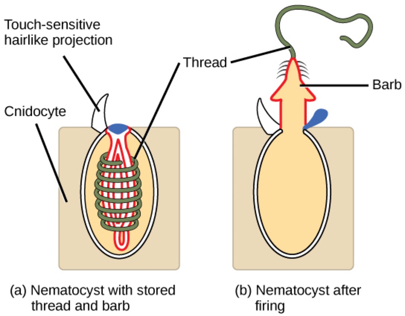 Nematocysts: pecialized organelles inside cnidocytes that eject a stinging thread