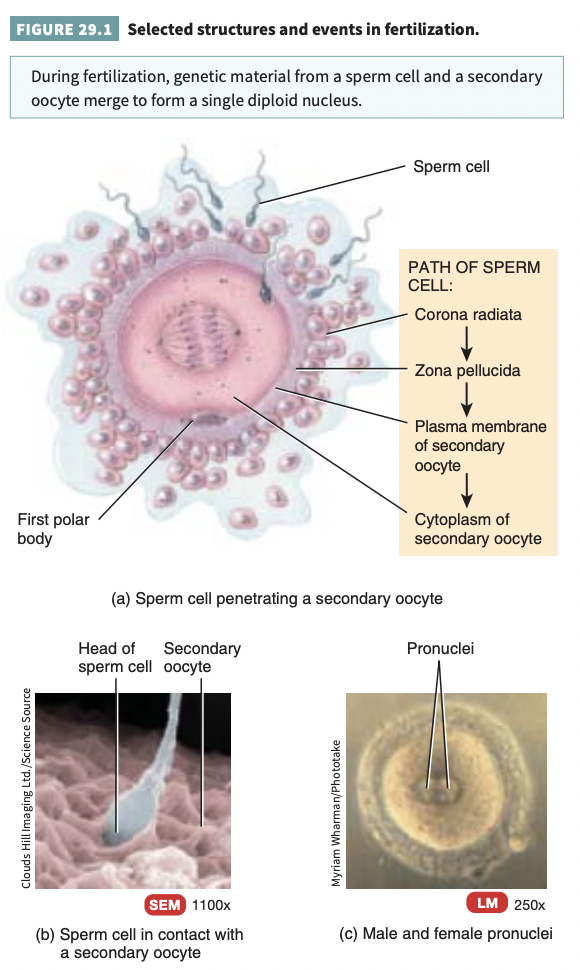 During this event, the genetic material from a haploid sperm cell (spermatozoon) and a haploid secondary oocyte merges into a single diploid nucleus. Occurs in the uterine (fallopian) tube.
