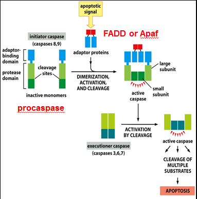 This dimer cleaves itself in the region by the DD, which frees up the initiator caspase dimer so it can move around the cytosol and activate executioner caspases.