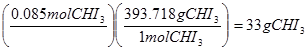 What is the mass of 0.085mol of iodoform (CHI3), a chemical used as a disinfectant, whose smell is sometimes described as the smell of a hospital?