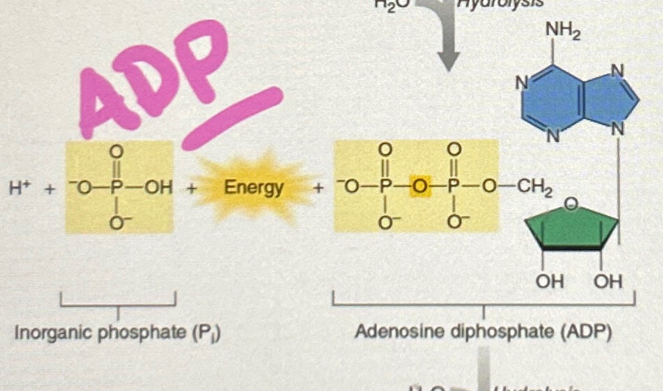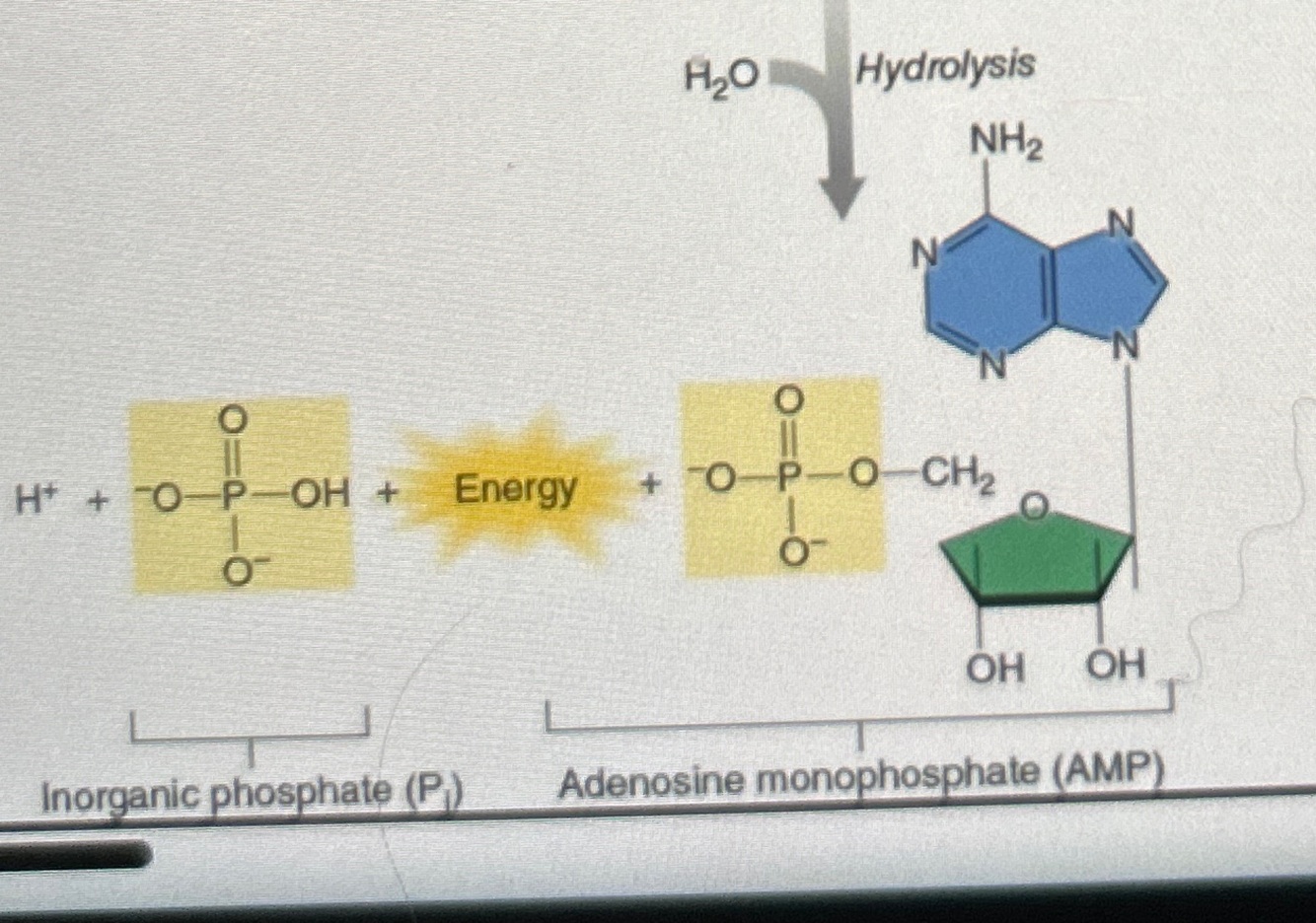 terminal phosphate bond releases energy and leaves AMP inorganic phosphate and a hydrogen ion