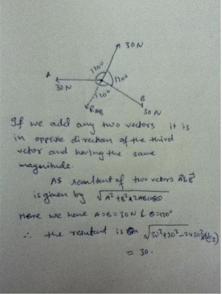 Three force vectors, each having a magnitude of 30 N, pull on an object in directions that are 120° apart from each other. Which of the following statements concerning the magnitude of the resultant force vector is true?