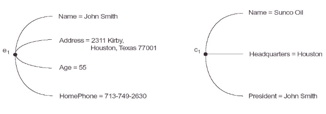two entities and their attribute values (ex: the entity [e1] and its attribute values [name, address, age, homephone].)