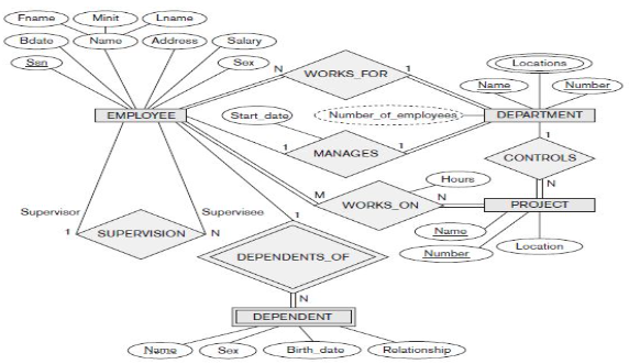 Age (which can be derived from the birth_date attributes of a person) and Number_of_employees (which can be derived by counting the number of employees related to (working for) that department.)
