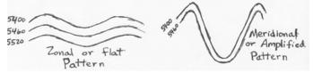 A ‘zonal’ (more flat) 500 mb pattern exhibits little wave structure, while a ‘meridional’ (or amplified) 500 mb pattern contains large northward and southward excursions.