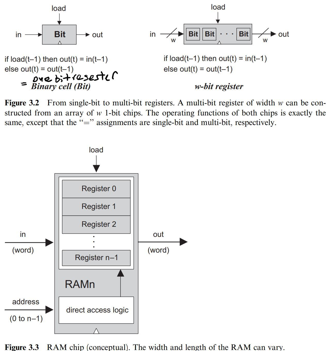 A classical RAM device accepts three inputs: a data input, an address input, and a load bit. The address specifies which RAM register should be accessed in the current time unit. In the case of a read operation (load=0), the RAM’s output immediately emits the value of the selected register. In the case of a write operation (load=1), the selected memory register commits to the input value in the next time unit, at which point the RAM’s output will start emitting it.
