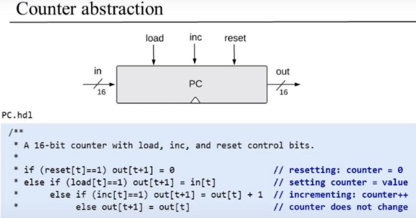 With that in mind, the interface of our Counter chip is similar to that of a register, except that it has two additional control bits labeled reset and inc. When inc=1, the counter increments its state in every clock cycle, emitting the value out(t)= out(t-1)+1. If we want to reset the counter to 0, we assert the reset bit; if we want to set the counter to a specific number, we put that number in the input and assert the load bit.