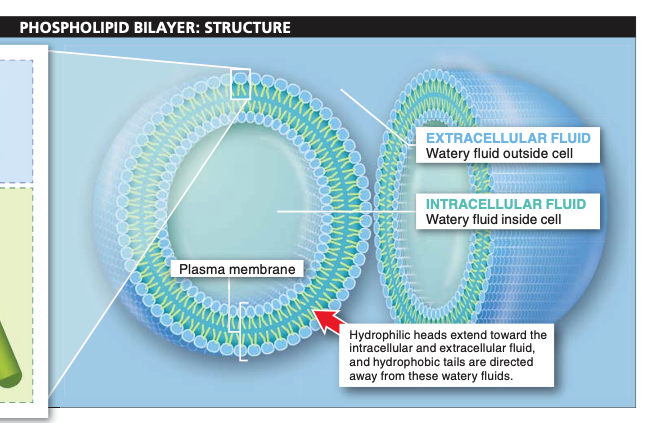 two layers of many sets of hydrophilic head and hydrophobic tails that form a barrier inside and outside the cell (almost like a row of individual magnets)