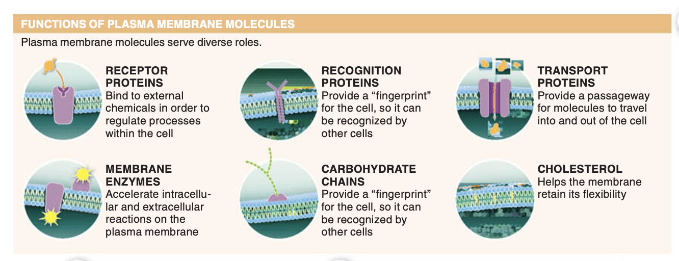 carbohydrate chains (helps be Identified by other cells), cholesterol (for membrane flexibility), receptor proteins (binds to external chemicals to be used for internal processes), recognition proteins (helps be Identified by other cells), transport proteins (molecules pass into cell), membrane enzymes (intracellular and extracellular reactions)