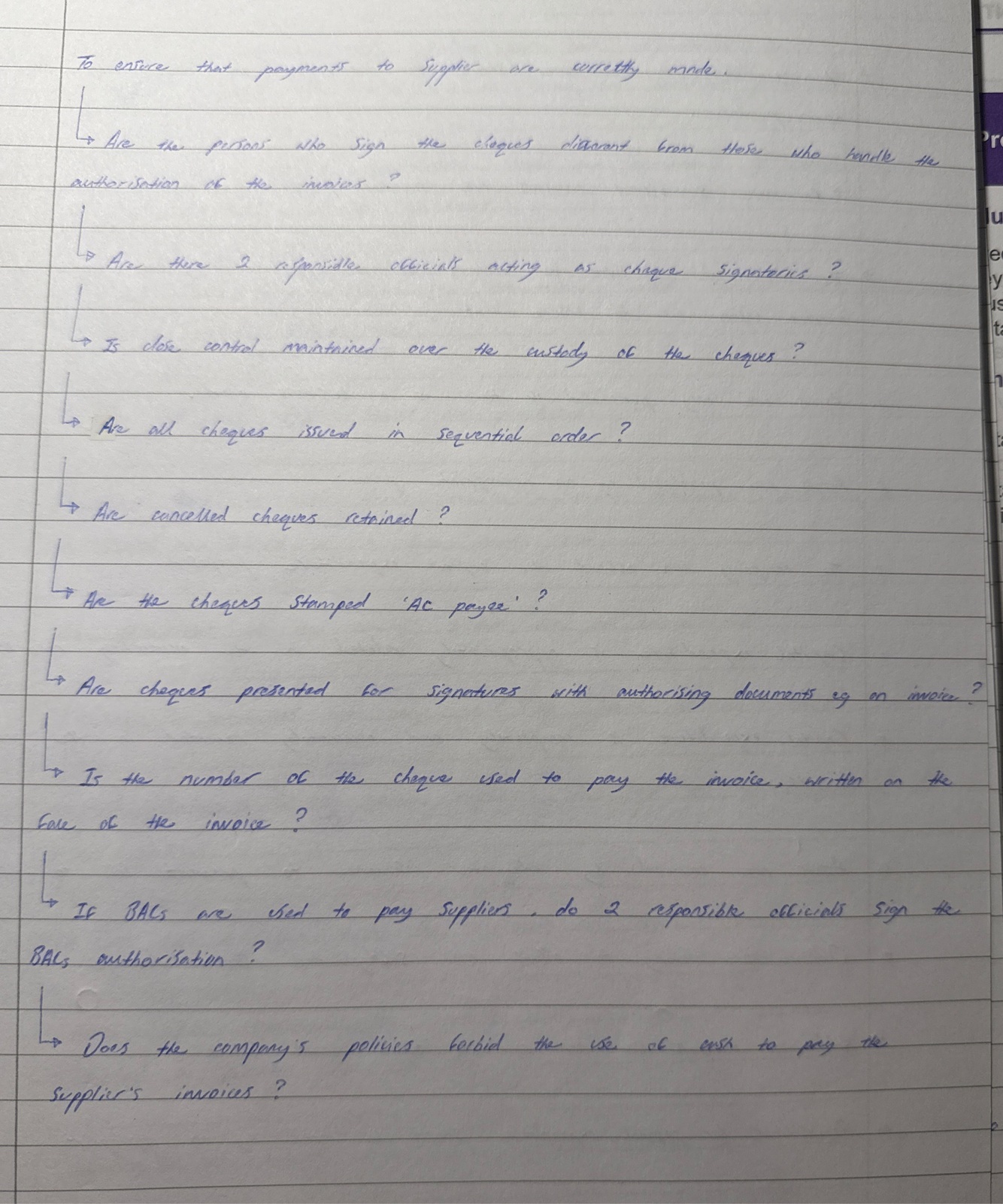 An internal control questionnaire for the purchase system (Yes or No).