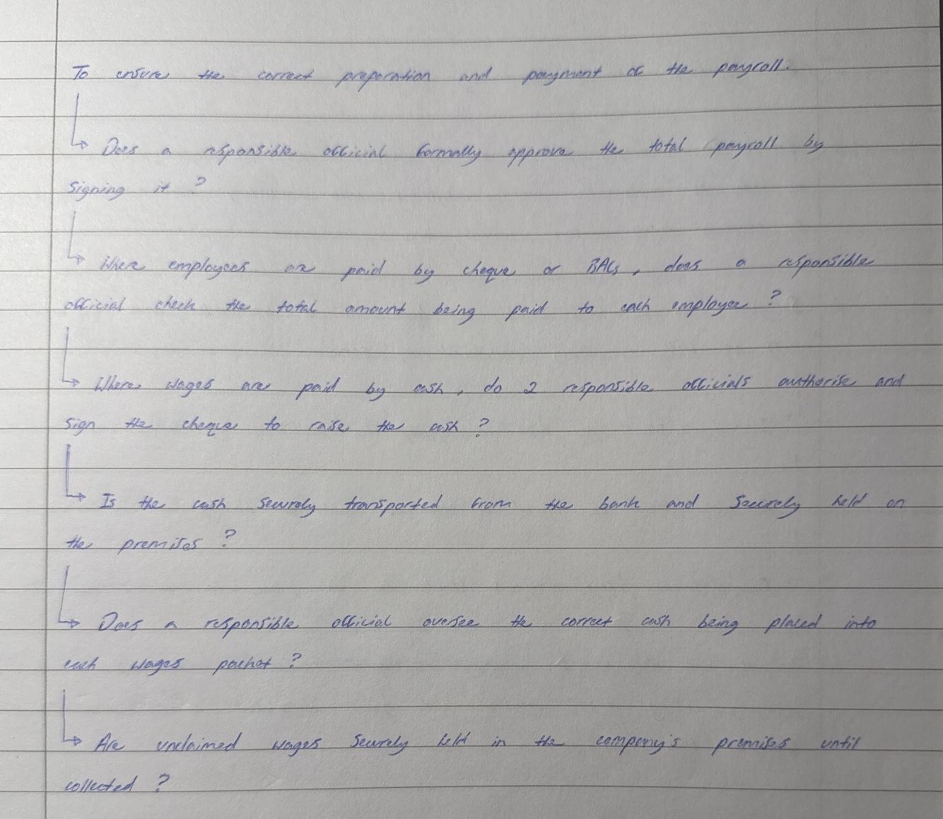 An internal control questionnaire for the payroll system (Yes or No).