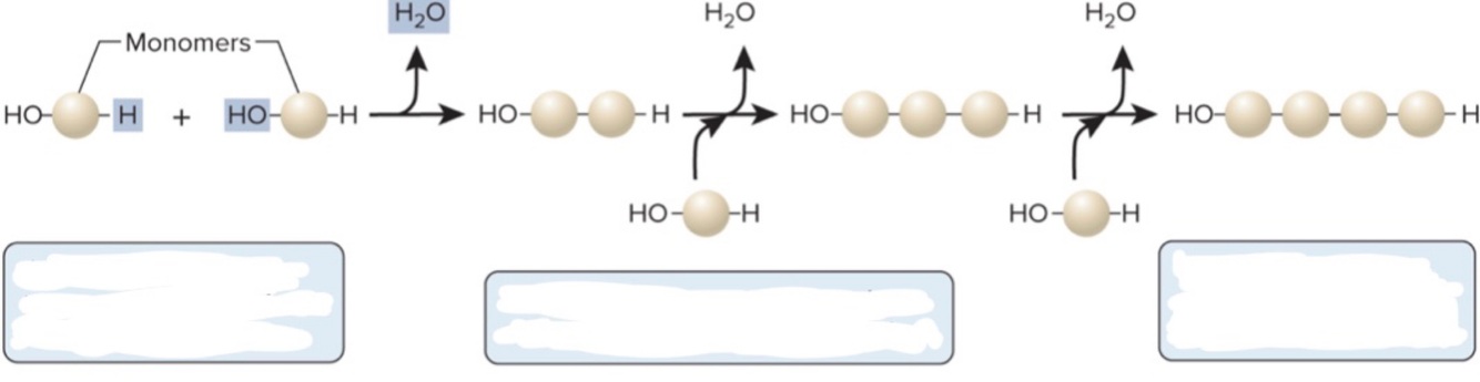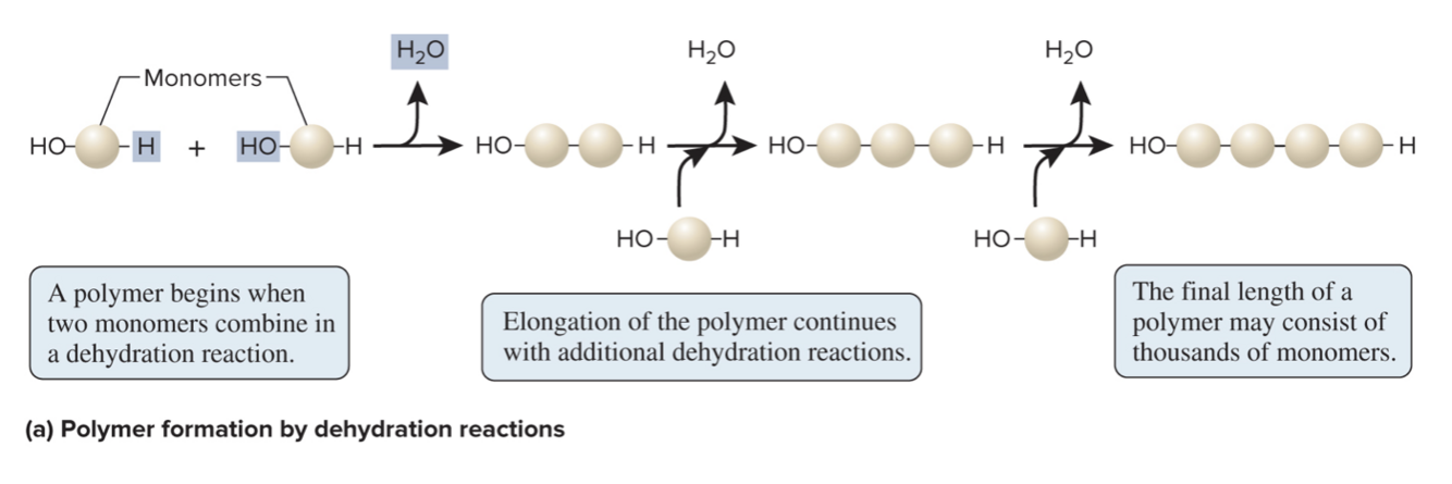 Dehydration reaction🧌! A molecule of water is REMOVED each time a new monomer is added so it can form long polymers.