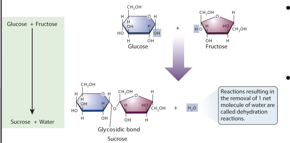 Monosaccharides are linked together by dehydration reactions , which is the removal of a water molecule, and this forms a disaccharide.🏜️ They are broken down through hydrolysis reactions, where water molecules are added🏝️. Some examples of disaccharides are sucrose, maltose, and lactose.