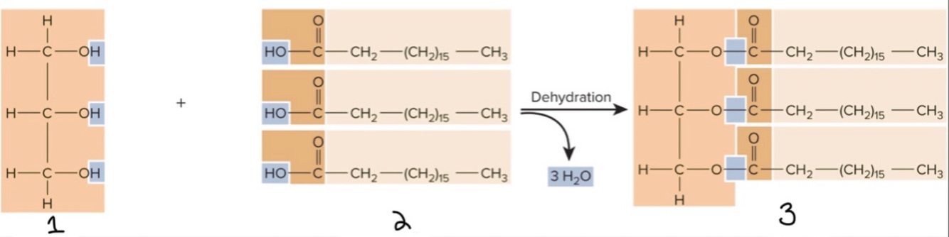 1) glycerol, 2) 3 fatty acids, 3) triglyceride