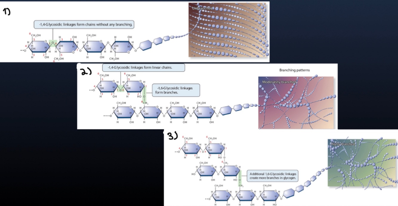 These are examples of polysaccharides, which are formed when many monosaccharides are linked together. 1) cellulose, 2) starch, 3) glycogen