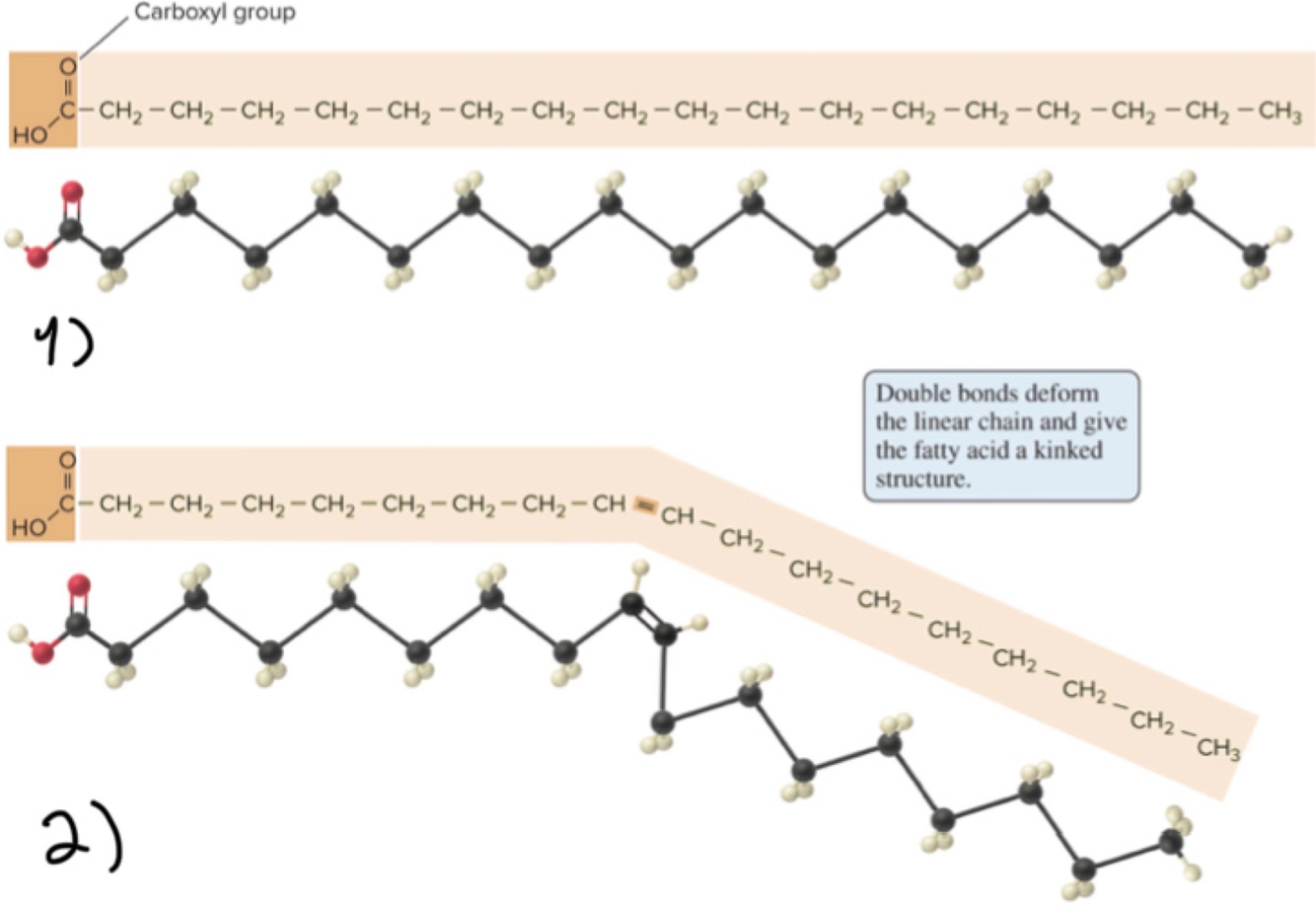 The two types of fatty acids are called saturated and unsaturated. 1) saturated (no kinks), 2) unsaturated (kinks and presence of double bond)