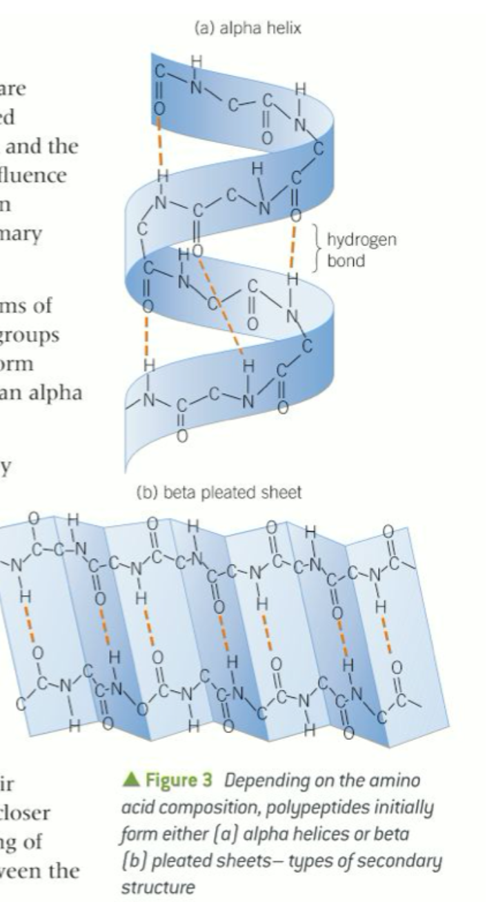 Hydrogen bonds may form within the amino acid chain, pulling it into a coil shape called an alpha helix (Figure 3a).