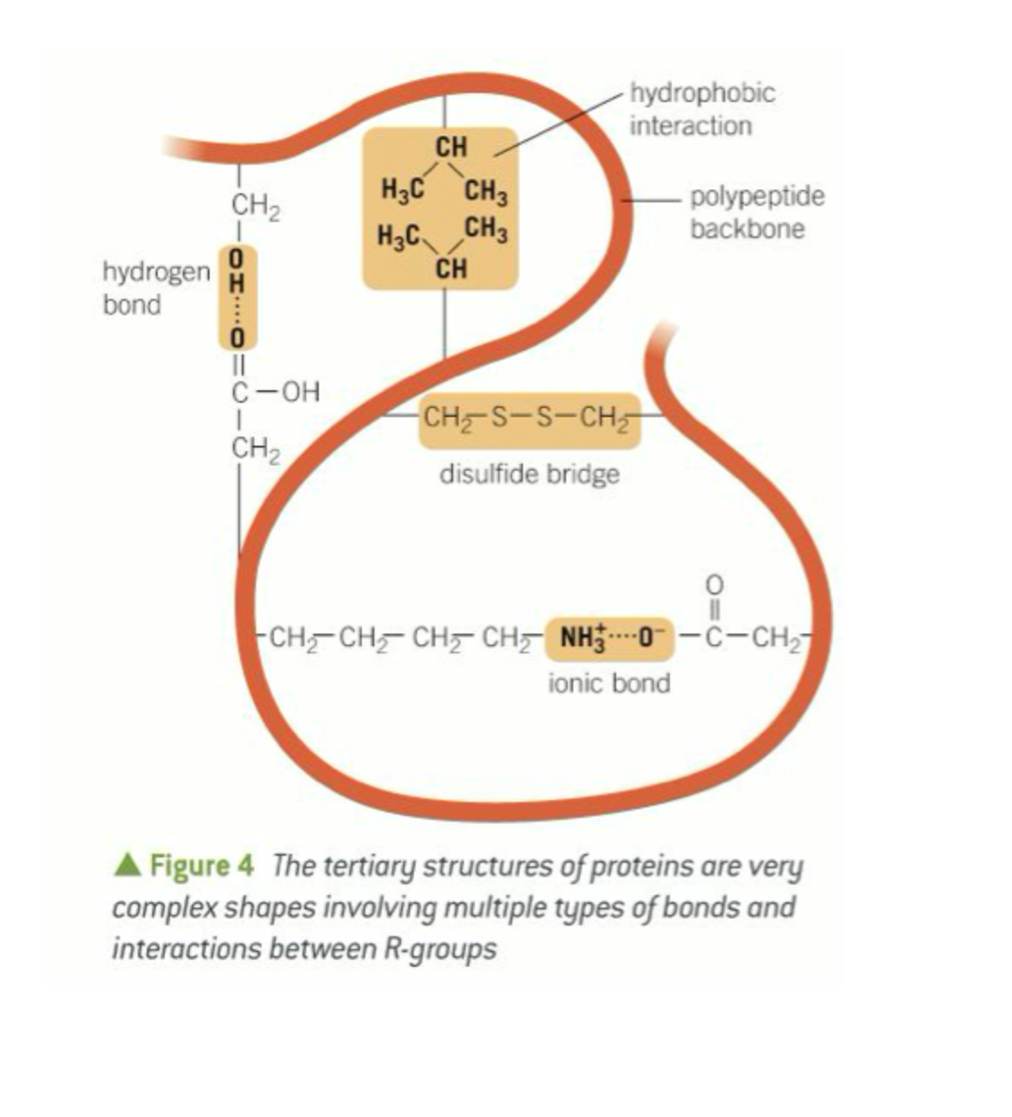 The following interactions occur between the R-groups in the Tertiary structure: