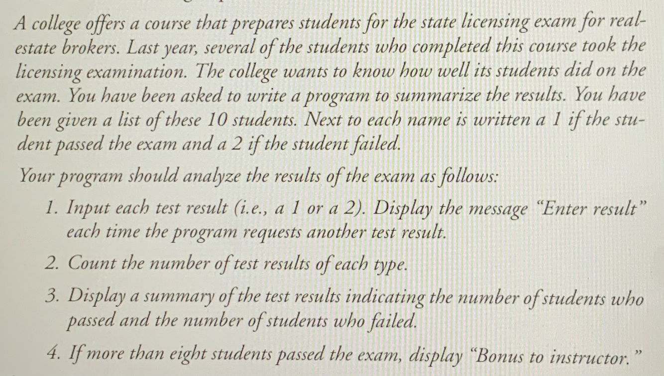 - After the script processes all the results, it must decide if more than 8 students passed the exam so that it can bonus the instructor